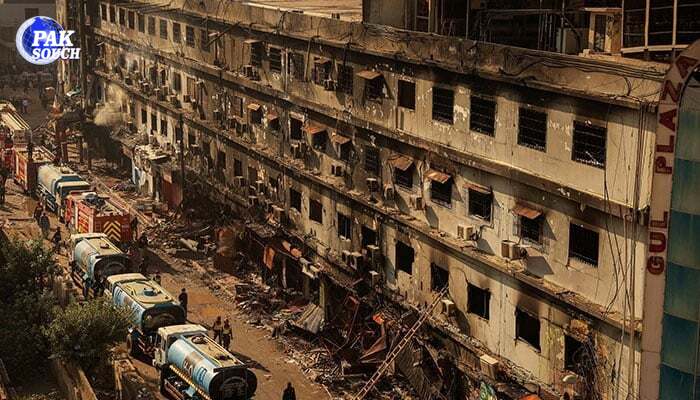 Karachi’s largest fire in more than a decade broke out on January 17 and quickly spread through the sprawling shopping complex, famous for its 1,200 family-owned stores selling wedding clothes, toys, crockery, and other goods.